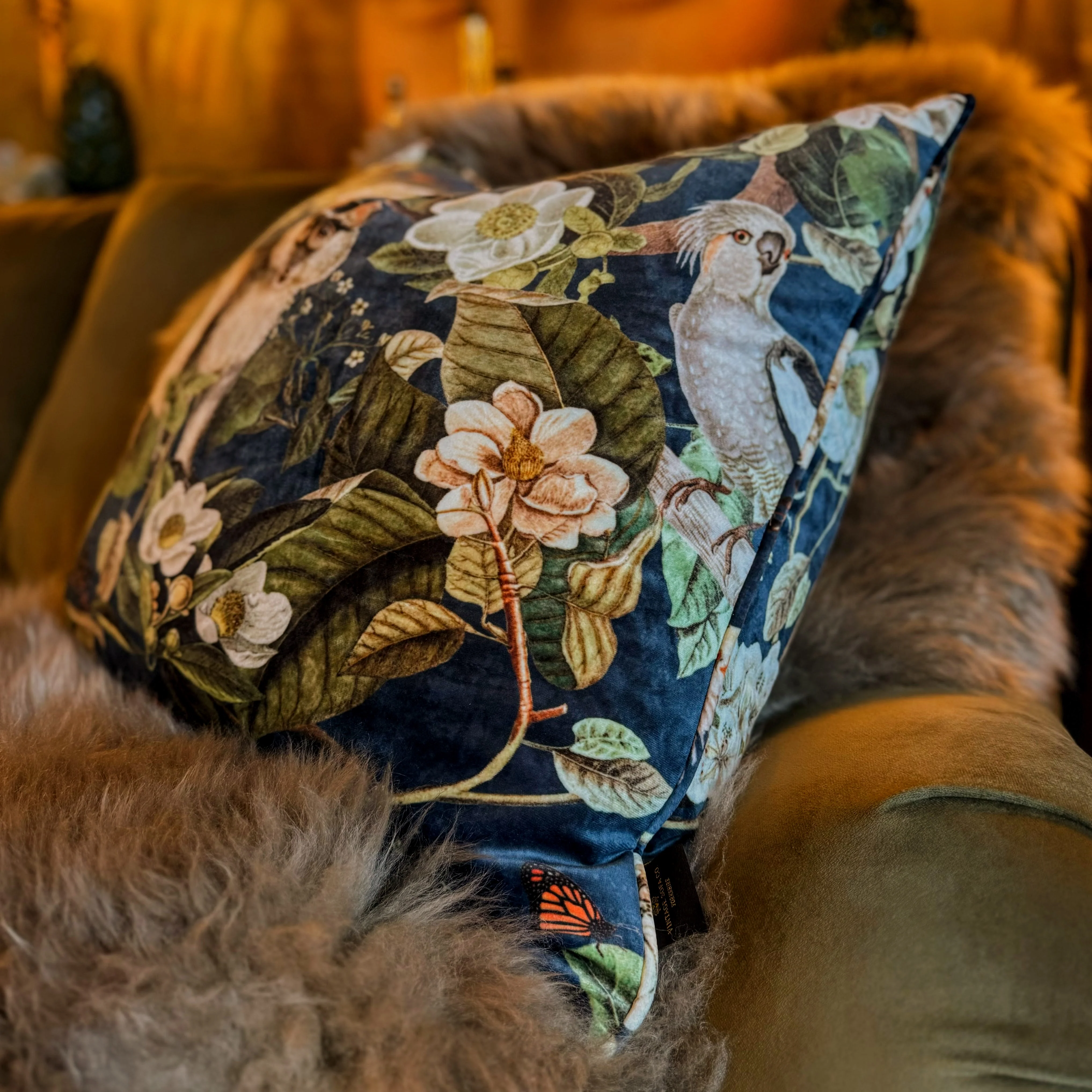Printed on sumptuously soft velvet, the intricate detail and rich colours evoke a sense of botanical luxury with a whimsical twist. The jungle-inspired print is perfect for adding character to an eclectic sofa, armchair, or bed.