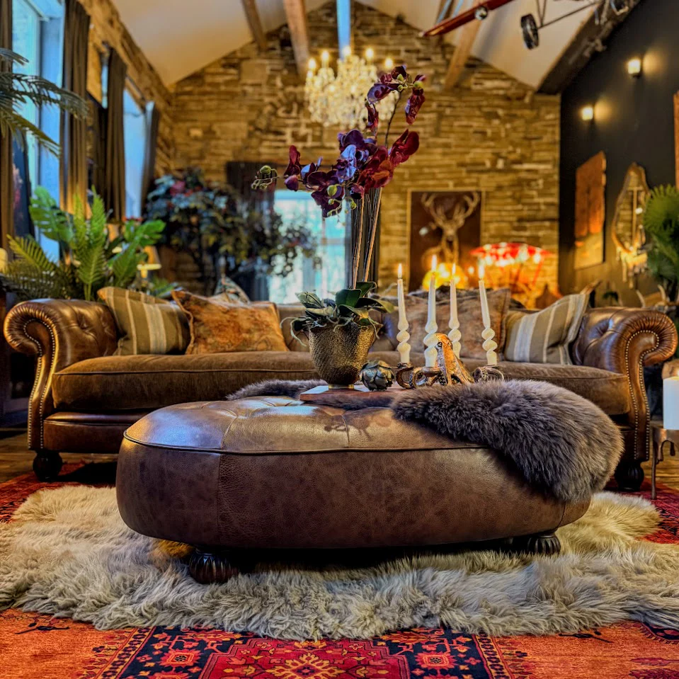 - Hand-studded scroll arms, a deep buttoned back and feather filled seat cushions.